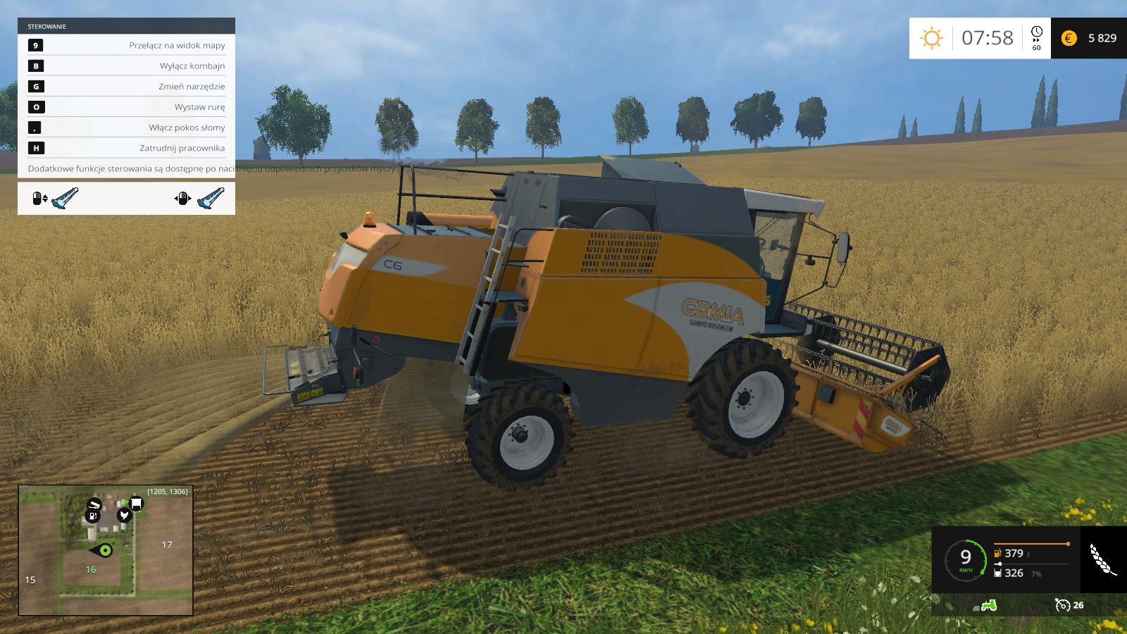 Vehicle information – Here you can see info like current speed, fuel amount, the plant that is being harvested/sowed, container capacity, implements attached and also the vehicle's maximum speed.